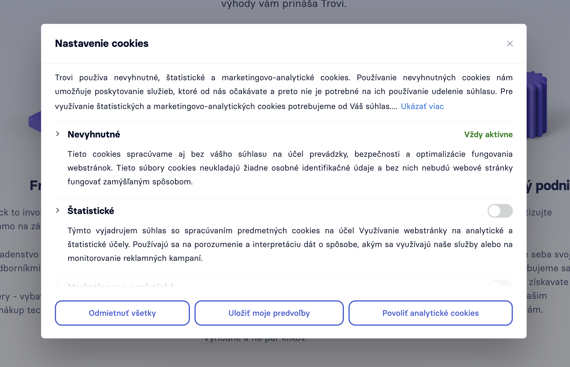 | Využívanie webstránky na analytické a štatistické účely | Štatistické cookies, Marketingovo-analytické cookies |