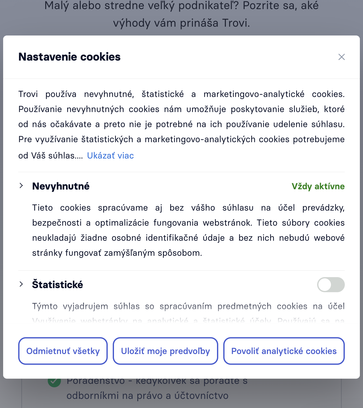 | Využívanie webstránky na analytické a štatistické účely | Štatistické cookies, Marketingovo-analytické cookies |